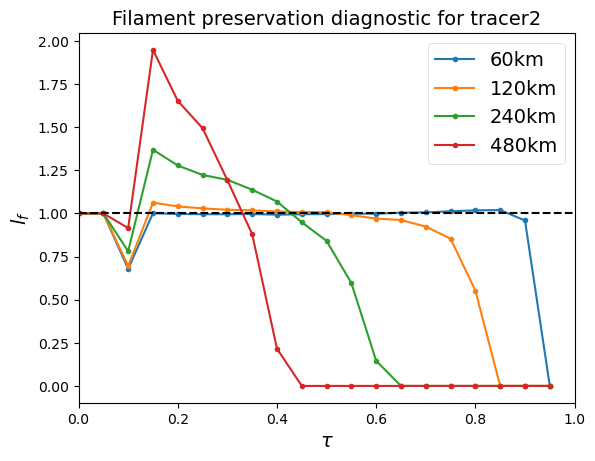 The ability of the horizontal advection scheme to preserve filaments is addressed in the filament_analysis step. It produces a figure similar to the following, which provides a comparison across resolutions, similar to Figure 6 from Lauritzen et al. 2012: