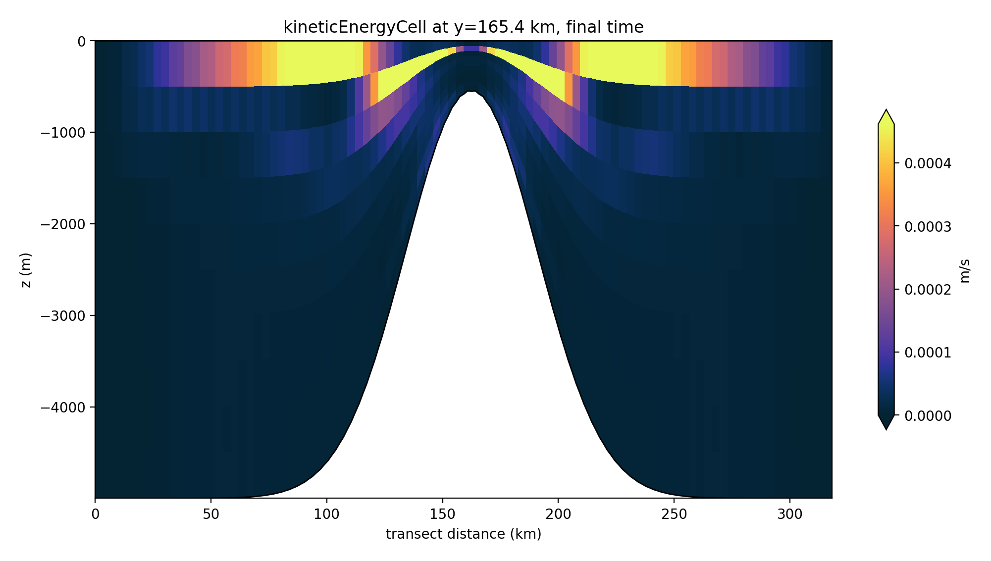 The seamount rises from a flat sea floor in the center of the domain.