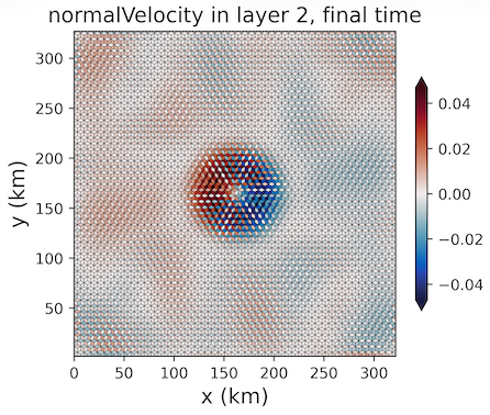 In a pure z-level vertical coordinate without partial bottom cells (partial_cell_type = full), the pressure gradient will remain zero and induce no flow to machine precision. When any layer tilting is added, including from partial bottom cells, some flow is introduced by the pressure gradient error. This is fundamentally because the pressure must be extrapolated vertically at cell centers to the mid-depth of the edge. The default setting is the sigma coordinate. These are the images produced in the viz folder.